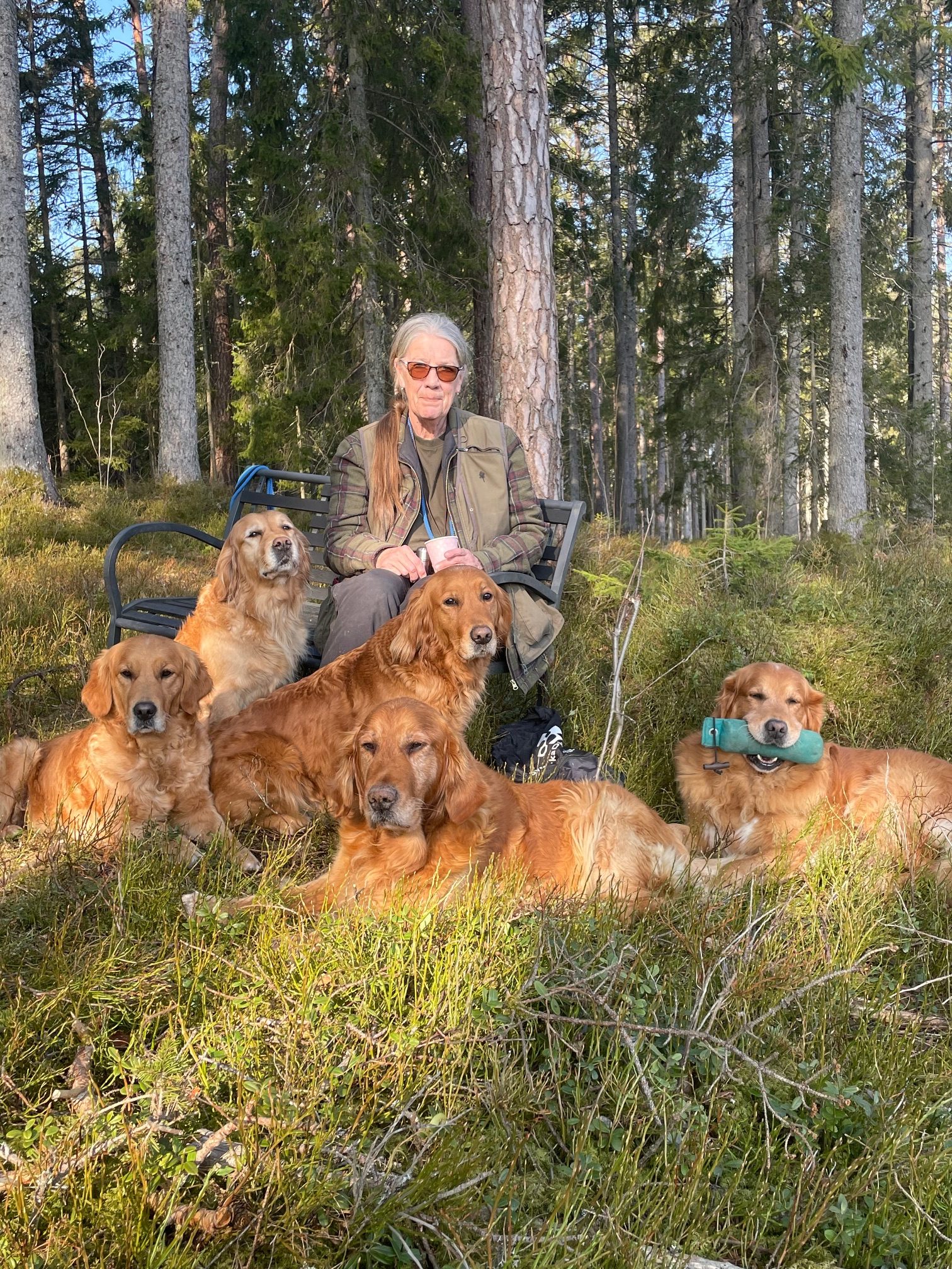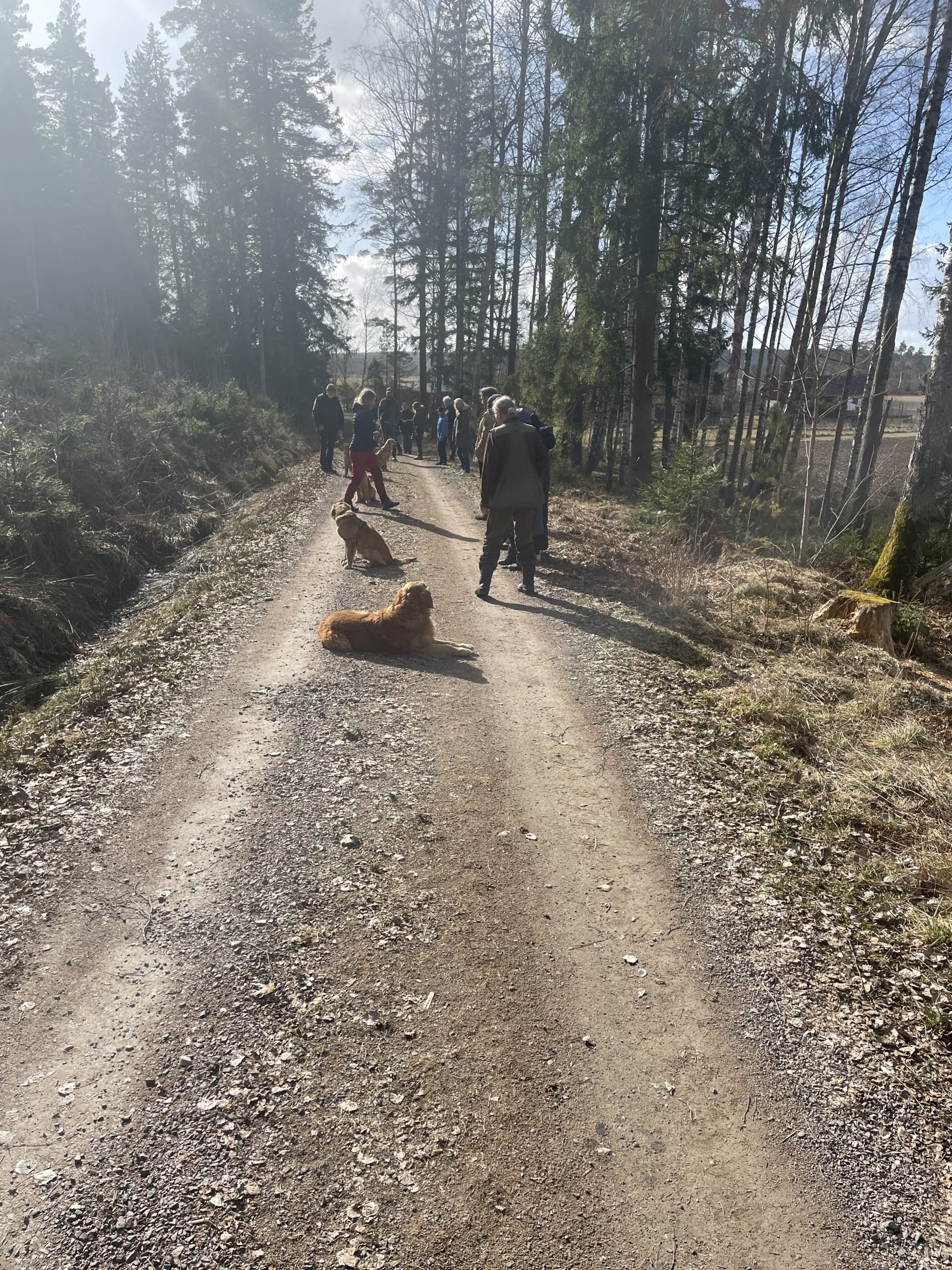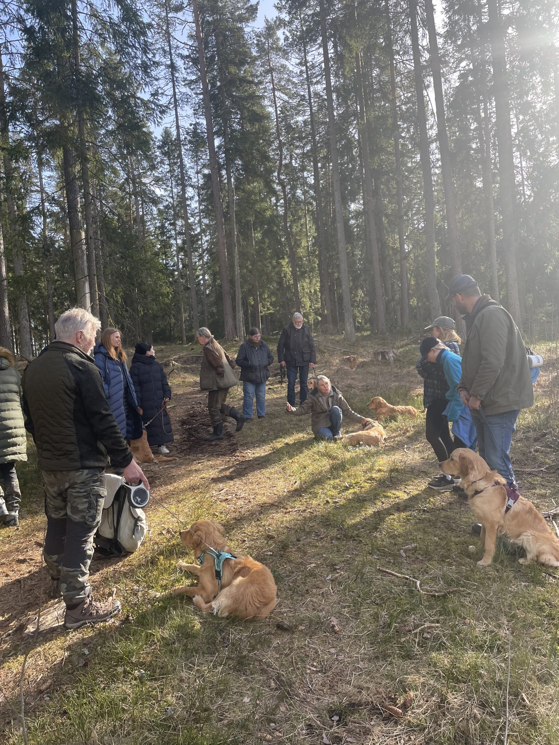 5e och 6e mars var de första härligt soliga vårdagarna i år och då passa vi på att skogsbada med våra hundar i olika omgångar och att apporterings- och sökträna. På bilden ser Du från vänster Målriktade Madicken (Maddie), Lussiga Lucia (Lussan), Kraftfulla Gloria, Nyårige Trolle med dummie i munnen och längst fram vår ålderskille 13årige Solstormige Ansgar.