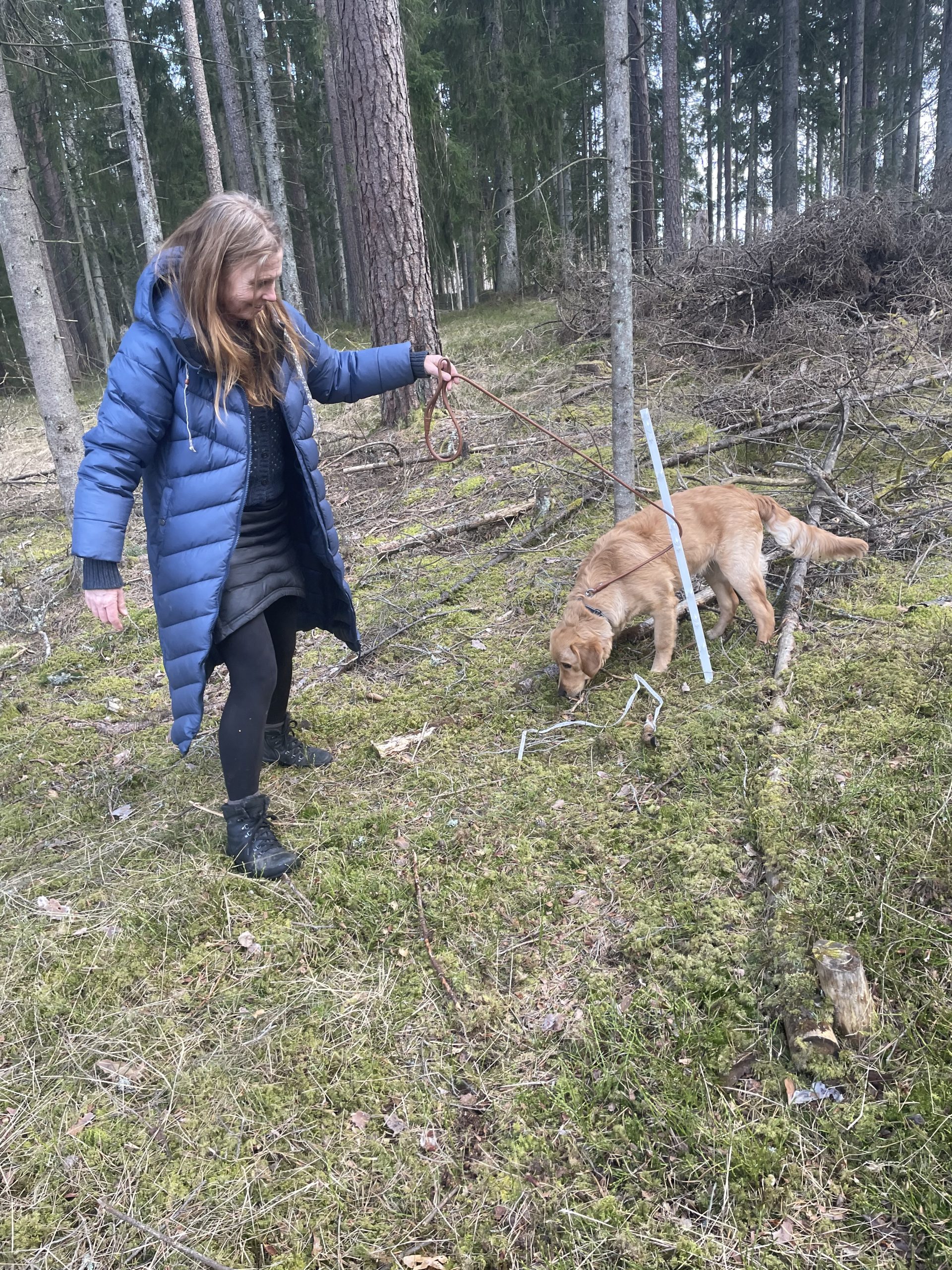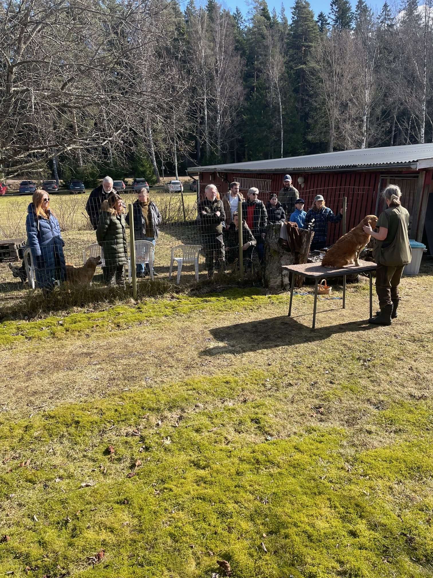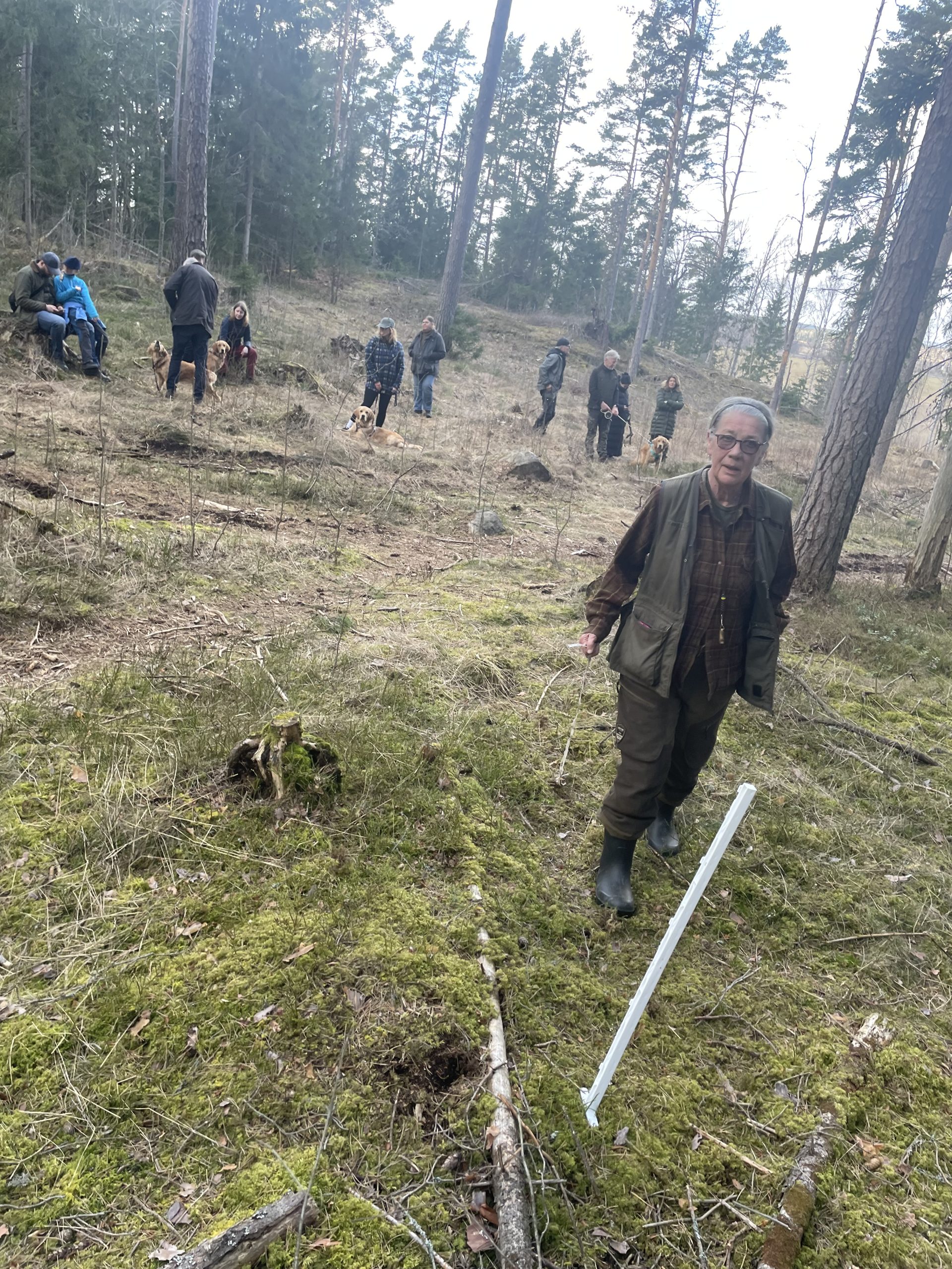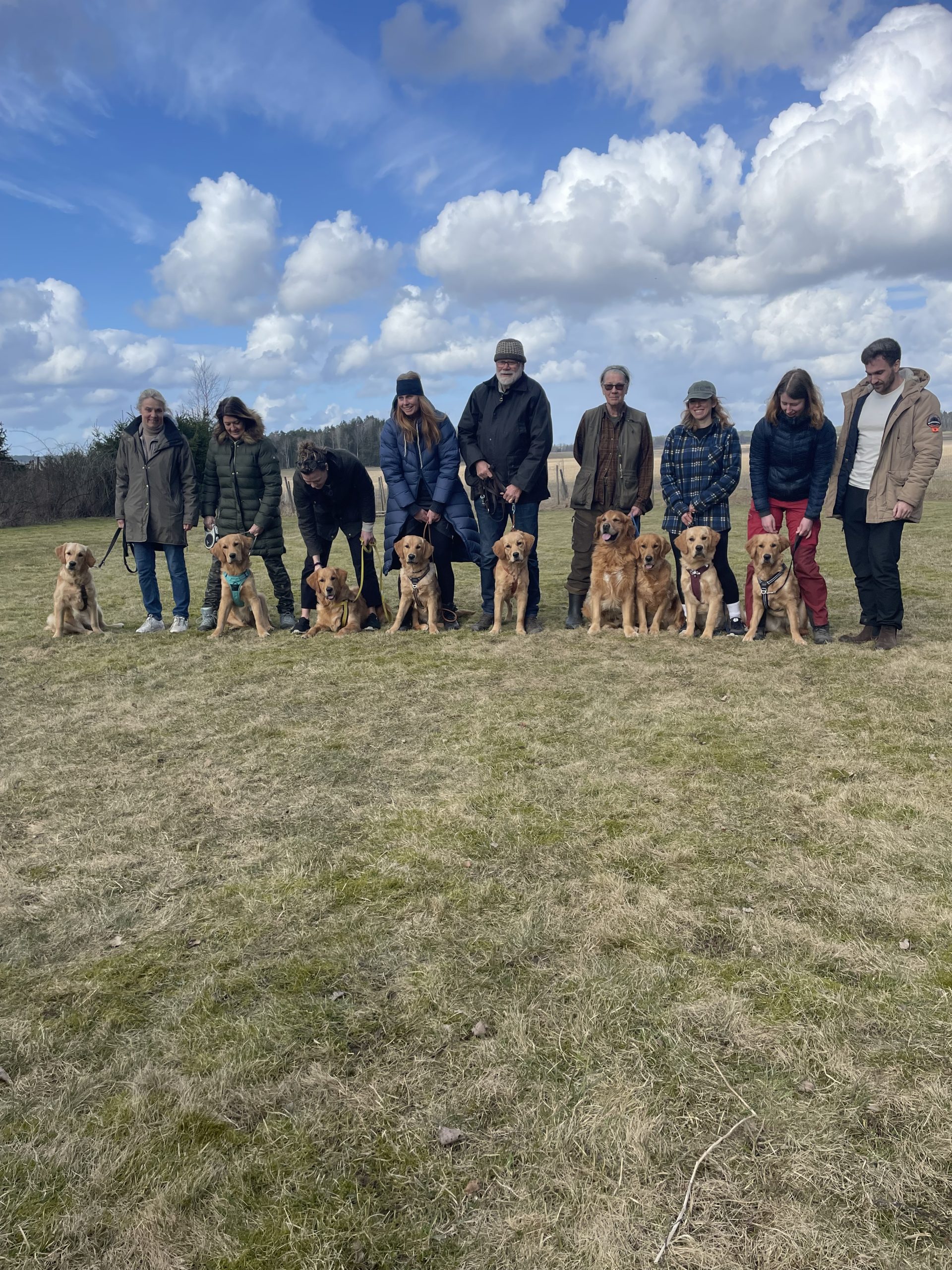 5e och 6e mars var de första härligt soliga vårdagarna i år och då passa vi på att skogsbada med våra hundar i olika omgångar och att apporterings- och sökträna. På bilden ser Du från vänster Målriktade Madicken (Maddie), Lussiga Lucia (Lussan), Kraftfulla Gloria, Nyårige Trolle med dummie i munnen och längst fram vår ålderskille 13årige Solstormige Ansgar.